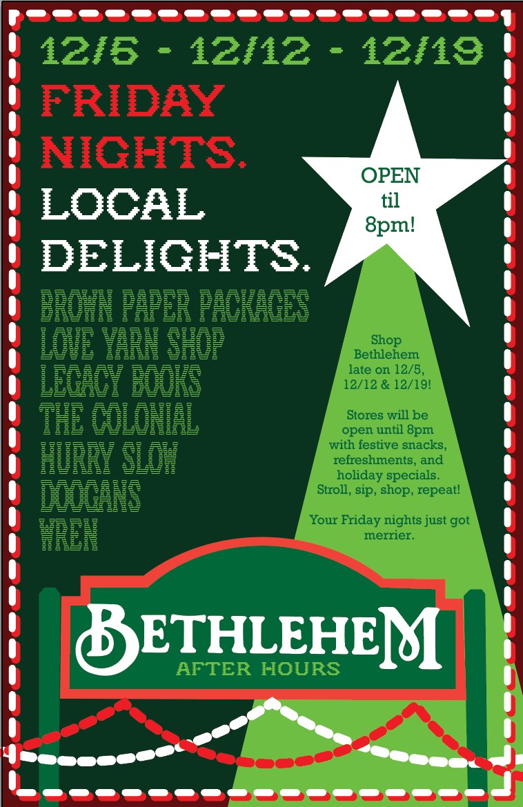 Celebrate Bethlehem!!! Holiday shopping season is fast approaching and while many of us will be “click & shopping”, remember the importance of shopping locally and keeping our North Country dollars in the North Country. Folks are encouraged to FIRST shop locally to find the perfect gift for the ones you love and Bethlehem merchants are making it easy for folks to do so. Beginning with Small Business Saturday (11/29) and continuing for the next THREE FRIDAYs, Main Street merchants in Bethlehem are making it easy for locals to shop. With plenty of free parking, a decorated Main Street, ever-changing holiday specials, and seasonal treats there has never been a better time to “Stroll, Sip, Shop, and Repeat!” Stores will be open with festive snacks, refreshments and holiday specials. Your Friday nights just got merrier!