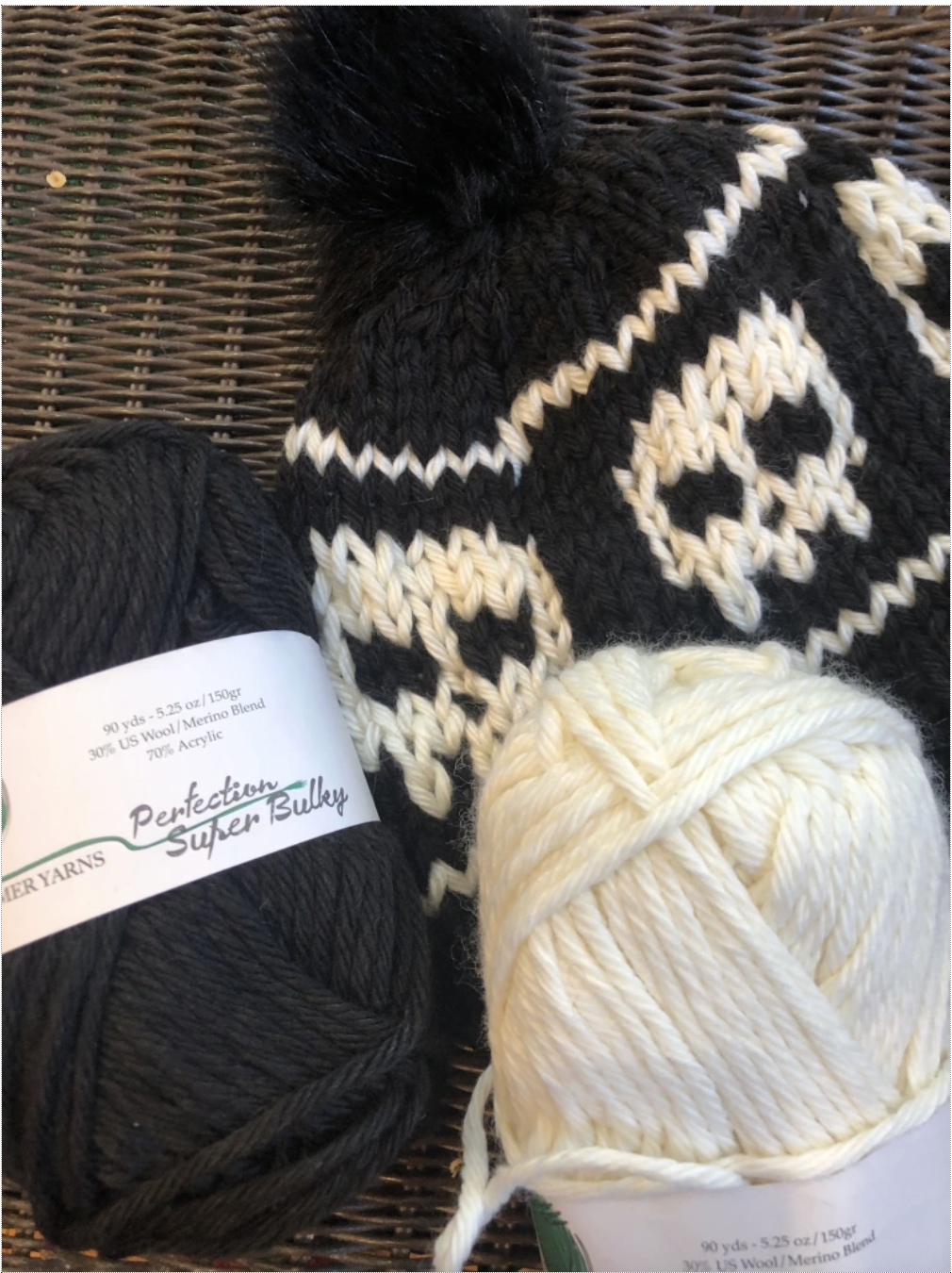 Skull Hat. Class includes 2 skeins of Kraemer Super Bulky yarn and a pom-pom. $32. Download free pattern from Meg Hardison’s website The Northern Moose